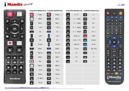 Im Folgenden zeigen wir Ihnen die Zuordnung jedes einzelnen Knopfes der Originalfernbedienung zu der Taste, die dieselbe Funktion auf der Ersatzfernbedienung ausführt. In einigen Fällen müssen Sie möglicherweise die UMSCHALT-Taste drücken, bevor Sie eine andere Taste drücken, um bestimmte Aktionen auszuführen. Diese zusätzlichen Funktionen werden oft wenig genutzt und dienen dazu, das Verständnis der Ersatzfernbedienung zu erleichtern oder weil die Originalfernbedienung mehr Tasten hat als das entsprechende Modell.
