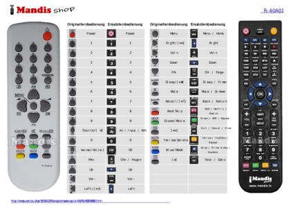 Im Folgenden zeigen wir Ihnen die Zuordnung jedes einzelnen Knopfes der Originalfernbedienung zu der Taste, die dieselbe Funktion auf der Ersatzfernbedienung ausführt. In einigen Fällen müssen Sie möglicherweise die UMSCHALT-Taste drücken, bevor Sie eine andere Taste drücken, um bestimmte Aktionen auszuführen. Diese zusätzlichen Funktionen werden oft wenig genutzt und dienen dazu, das Verständnis der Ersatzfernbedienung zu erleichtern oder weil die Originalfernbedienung mehr Tasten hat als das entsprechende Modell.