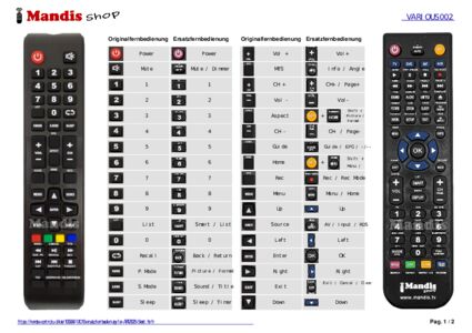 Im Folgenden zeigen wir Ihnen die Zuordnung jedes einzelnen Knopfes der Originalfernbedienung zu der Taste, die dieselbe Funktion auf der Ersatzfernbedienung ausführt. In einigen Fällen müssen Sie möglicherweise die UMSCHALT-Taste drücken, bevor Sie eine andere Taste drücken, um bestimmte Aktionen auszuführen. Diese zusätzlichen Funktionen werden oft wenig genutzt und dienen dazu, das Verständnis der Ersatzfernbedienung zu erleichtern oder weil die Originalfernbedienung mehr Tasten hat als das entsprechende Modell.