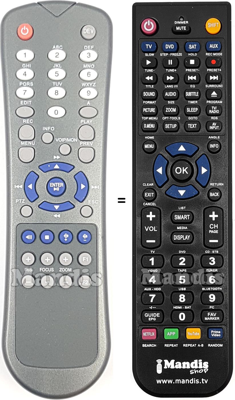 Power, DEV, 1, 2, 3, 4, 5, 6, 7, 8, 9, Edit, 0, A, Play, Prev, Rec, Menu, Info, VOIP/MON, Up/>>, Down/>>, Right/>>I, Left/I<<, Enter/Play/Pause, PTZ, ESC, <II, Stop, Vol+, Vol-, Iris+, Iris-, Focus+, Focus-, Zoom+, Zoom-, F1, F2