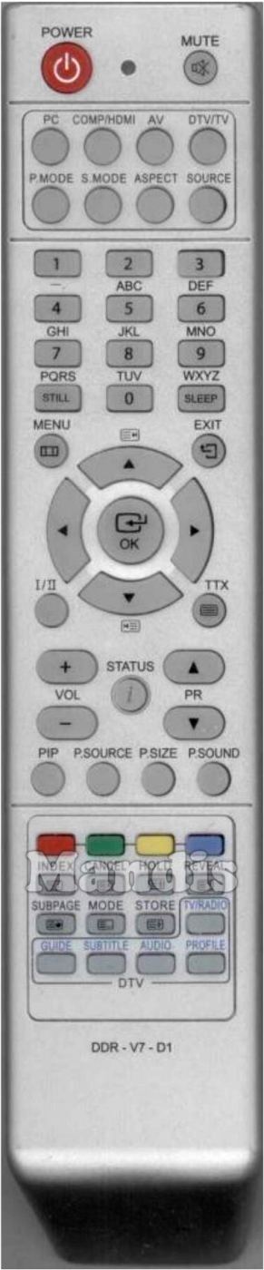 Power, Mute, PC, Comp / HDMI, AV, DTV / TV, P.Mode, S.Mode, Aspect, Source, 1, 2, 3, 4, 5, 6, 7, 8, 9, 0, Still, Sleep, Menu, Exit, Up, Left, OK, Right, Down, I / II, TTX, Vol+, Vol-, Status / i, PR+, PR-, PIP, P.Source, P.Size, P.Sound, Red, Green, Yellow, Blue, Index, Cancel, Hold, Reveal, Subpage, Mode, Store, TV / Radio, Guide, Subtitle, Audio, Profile