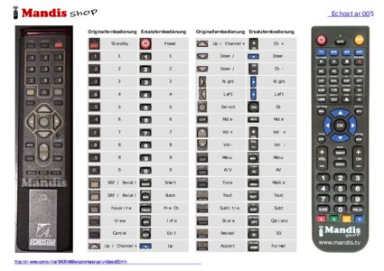 Diese Fernbedienung ersetzt die meisten Funktionen Ihres Echostar005. Es ist keine Universalfernbedienung, sondern eine Kopie mit den meisten Tasten und Funktionen Ihres Originals.