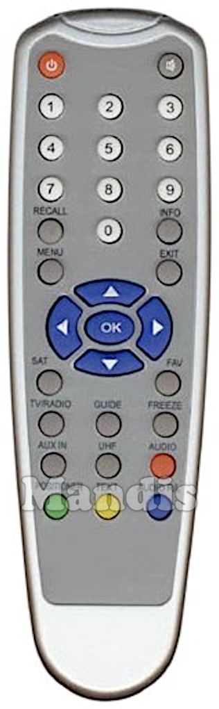 Power, Mute, 1, 2, 3, 4, 5, 6, 7, 8, 9, 0, Recall, Info, Menu, Exit, Up, Left, OK, Right, Down, SAT, FAV, TV/Radio, Guide, Freeze, Aux In, UHF, Red / Audio, Green / Positioner, Yellow / Text, Blue / Audio R/L