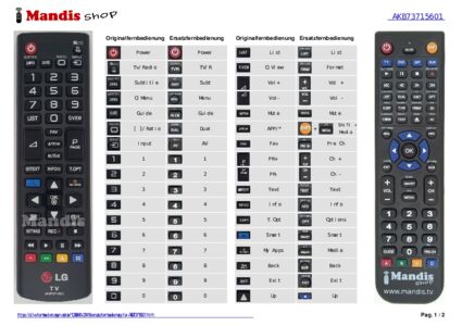 Diese Fernbedienung erfüllt alle Funktionen der Originalfernbedienung: Power, TV / Rad, Input, Q.Menu, Ratio, Subtitle, 1, 2, 3, 4, 5, 6, 7, 8, 9, 0, Guide, Q.View, Vol +, Vol -, FAV, Info, Mute, P + / Page +, P - / Page -, App / *, Home, My Apps, Text, T.Opt, Back, Exit, Up, Right, Down, Left, OK, AD, Rec / *, Stop, <<, Play, Pause, >>, Red, Green, Yellow, Blue