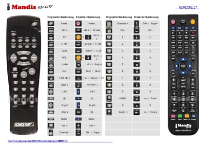 Im Folgenden zeigen wir Ihnen die Zuordnung jedes einzelnen Knopfes der Originalfernbedienung zu der Taste, die dieselbe Funktion auf der Ersatzfernbedienung ausführt. In einigen Fällen müssen Sie möglicherweise die UMSCHALT-Taste drücken, bevor Sie eine andere Taste drücken, um bestimmte Aktionen auszuführen. Diese zusätzlichen Funktionen werden oft wenig genutzt und dienen dazu, das Verständnis der Ersatzfernbedienung zu erleichtern oder weil die Originalfernbedienung mehr Tasten hat als das entsprechende Modell.