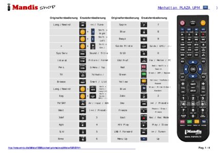 Ein Dokument ist enthalten, um die Verwendung der neuen Fernbedienung zu erleichtern, indem es die Tastenbelegung zeigt.