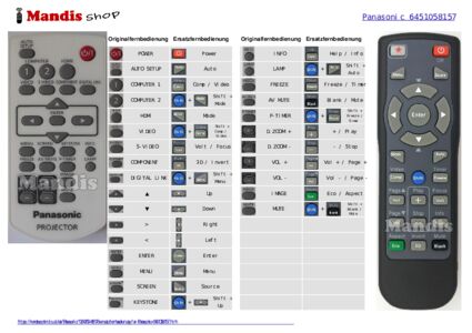 Die original Fernbedienung meines Panasonic Beamers war unreperabl defekt. Ein Ersatz war nirgends zu finden. Zum Glück entdeckte ich Mandis und bestellte die Ersatzfernbedienung nach der Originalnummer. Die nach kurzer Lieferzeit eingelangte Ersatzfernbedienung erfüllt alle, für den Betrieb wesentlichen Funktionen und es gibt dafür eine perfekte Anleitung.Das umständliche Einstellen von Schärfe, Zoom, Menue usw. direkt am Beamer geht jetzt wieder per Fernbedienung. Danke Mandis!!