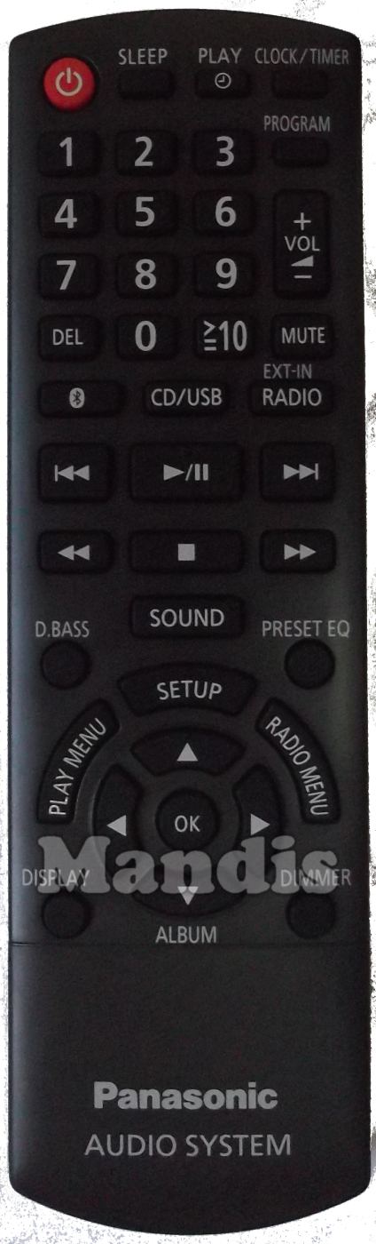 Power, Sleep, Play, Clock/Timer, 1, 2, 3, 4, 5, 6, 7, 8, 9, 0, DEL, +10, Program, Vol+, Vol-, Bluetooth, CD/USB, Mute, Radio/EXT-IN, I<<, Play/Pause, >>I, <<, >>, D.Bass, Sound, Preset EQ, Setup, Play Menu, Radio Menu, Up, Down/Album, Left, Right, OK, Display, Dimmer, Stop