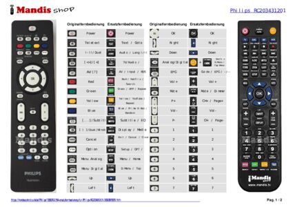 Diese Fernbedienung erfüllt alle Funktionen der Originalfernbedienung: Power, Teletext, Dual I / II, , AV, Red, Geen, Yellow, Blue, Subtitle, Dual Window, Cancel, Option, Menu Analog, Menu Digital, Up, Right, Down, Left, OK, Analog / Digital, EPG, Vol +, Vol -, Mute, P +, P -, 1, 2, 3, 4, 5, 6, 7, 8, 9, 0, Info, P<P / Back, Ambilight ON/OFF, Ambilight Mode, Sound, Picture