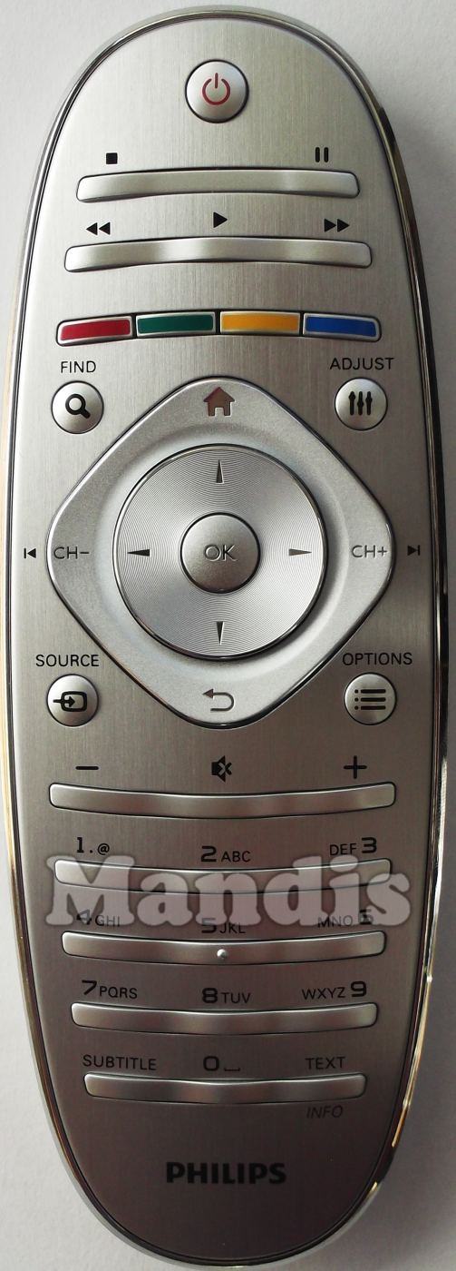 Power, Stop, Pause, <<, Play, >>, Red, Green, Yellow, Blue, Find, III/Adjust, Source, Options, OK, Home, Return, CH+/>I, CH-/I<, Up, Down, Right, Left, Vol-, Mute, Vol+, 1, 2, 3, 4, 5, 6, 7, 8, 9, 0, Subtitle, Text/ Info