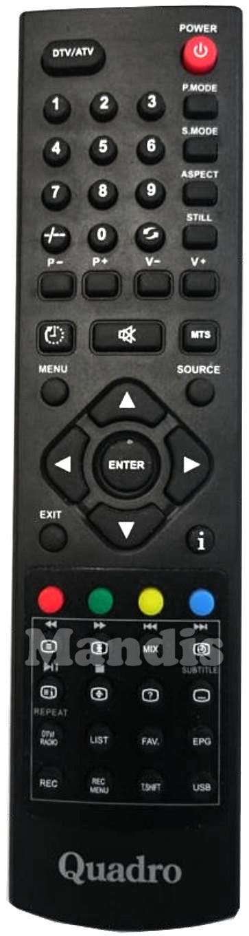 Fernbedienung Original QUA003 zur Steuerung der TV-Geräte der Marke Quadro. Es handelt sich um eine Originalfernbedienung.