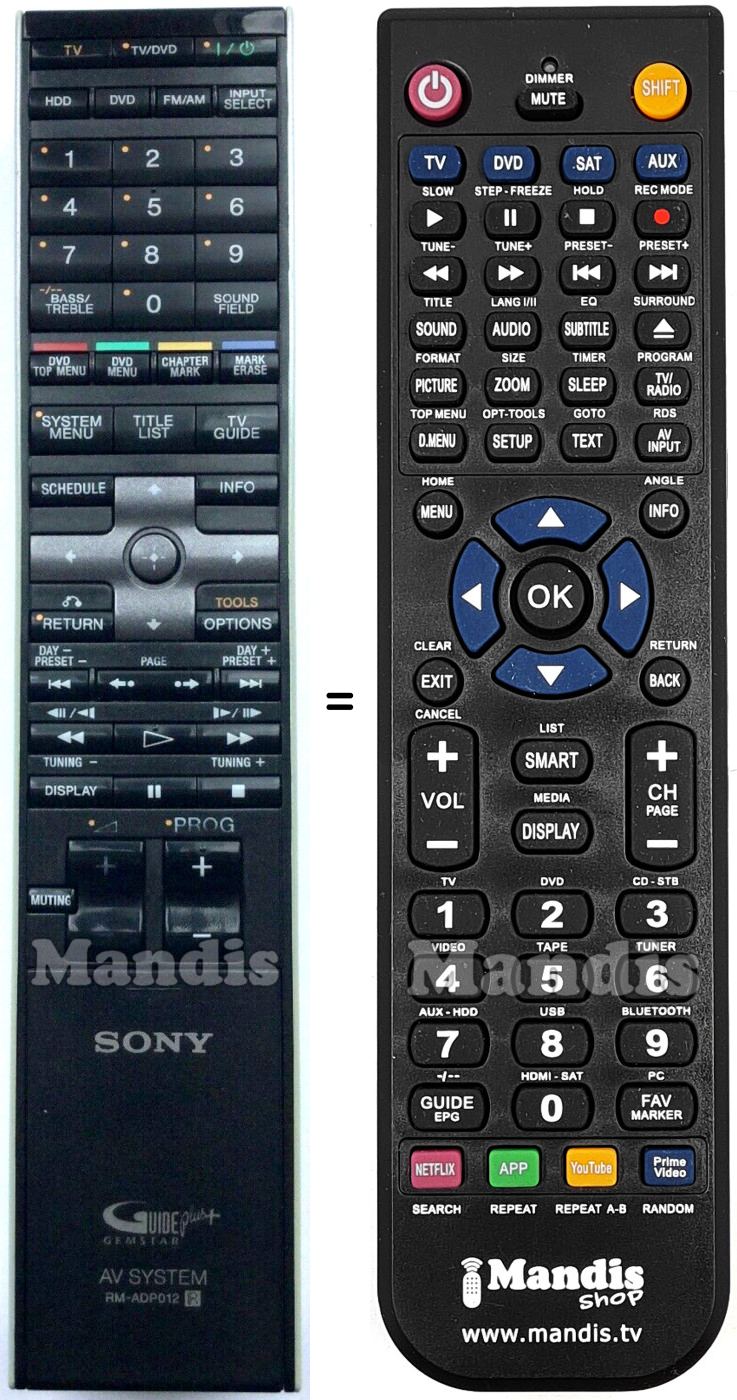 Diese Fernbedienung ersetzt die meisten Funktionen Ihres RM-ADP012. Es ist keine Universalfernbedienung, sondern eine Kopie mit den meisten Tasten und Funktionen Ihres Originals.