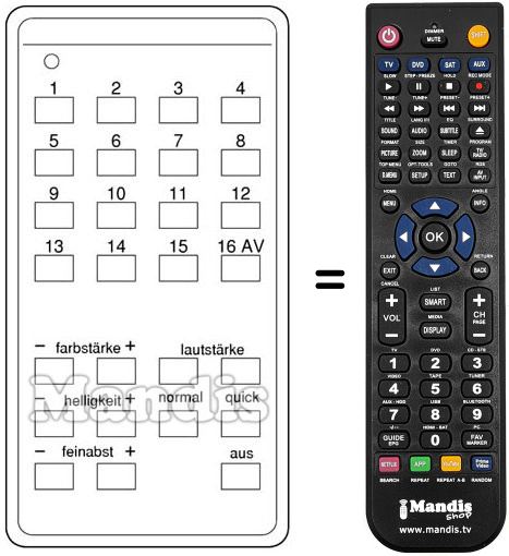 Fernbedienung, die das Original und die Gesamtheit seiner Funktionen, vollständig ersetzt. Es handelt sich jedoch nicht um eine Universalfernbedienung sondern um eine Fernbedienung die das Original ersetzt. Sie erhalten eine nach Einlegen der Batterien sofort einsatzbereite Fernbedienung. Jegliches Programmieren entfällt. Wir geben umfassende Garantie dafür, dass diese Fernbedienung alle Funktionen der Originalfernbedienung erfüllt.