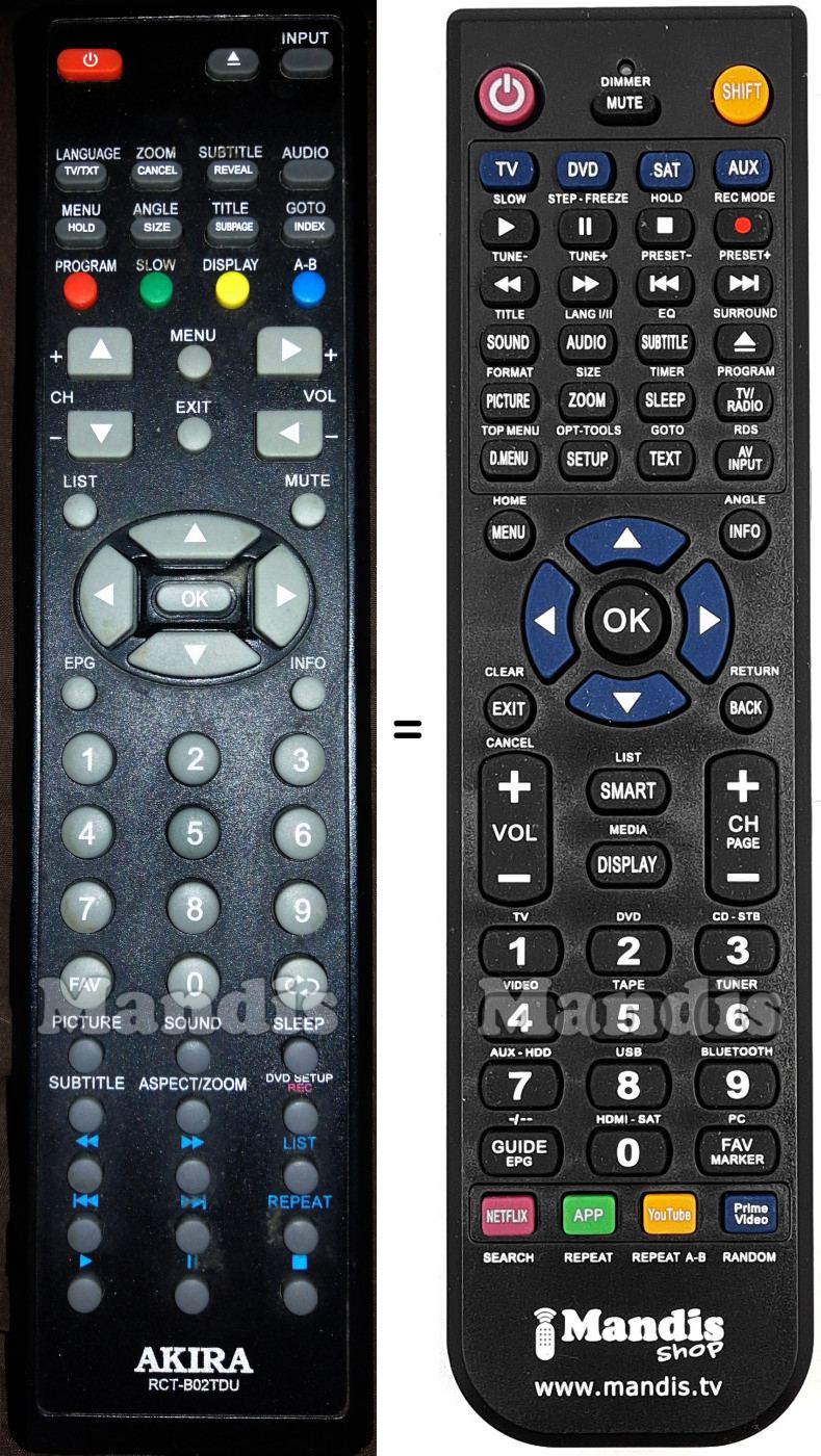 This remote control fully replaces your RCT-B02TDU and offers all the functions of the original.