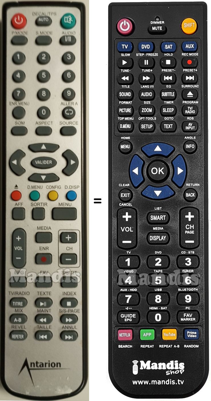 Below, we will show you the correspondence between each button on the original remote control and the button that performs the same function on the replacement remote control. In some cases, you may need to press the SHIFT key before pressing another button to perform certain actions. These additional functions are often not widely used and are included to facilitate understanding of the replacement remote control, or because the original remote control has more buttons than its equivalent.