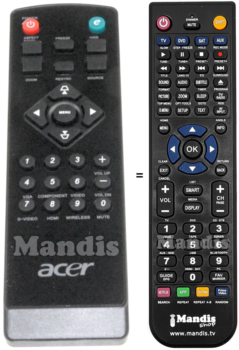 This remote control performs all the functions of the original remote control: Power, e, Aspect Ratio, Freeze, Hide, Zoom, Resync, Source, Up / Keystone+, Down / Keystone-, Left, Menu, Right, 1, 2, 3, Vol UP, Vol DN, 0 / Mute, 4 / VGA, 5 / Component, 6 / Video, 7 / S-Video, 8 / HDMI, 9 / Wireless