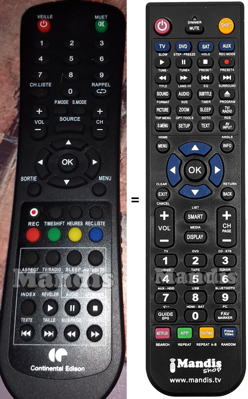 Below, we will show you the correspondence between each button on the original remote control and the button that performs the same function on the replacement remote control. In some cases, you may need to press the SHIFT key before pressing another button to perform certain actions. These additional functions are often not widely used and are included to facilitate understanding of the replacement remote control, or because the original remote control has more buttons than its equivalent.