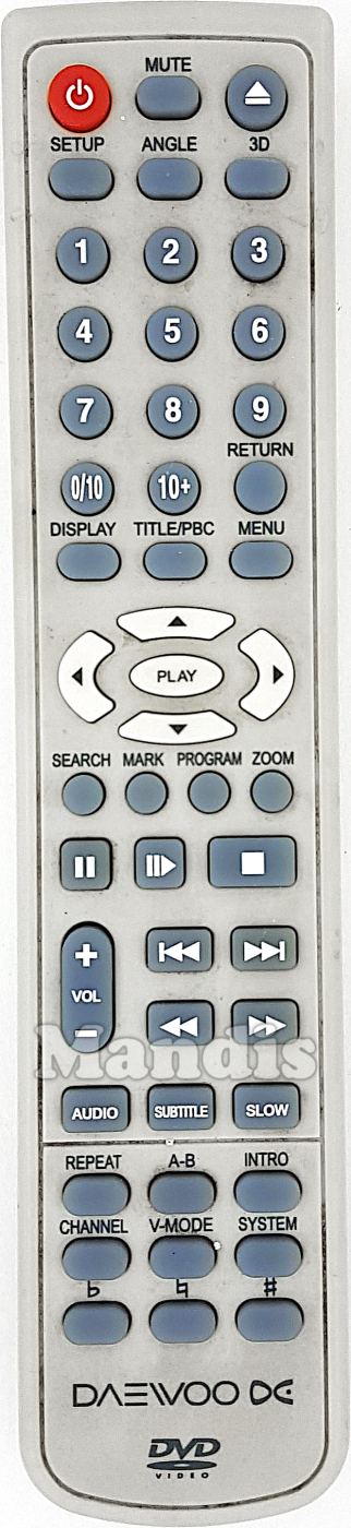 Power, Mute, Open / Close, Setup, Angle, 3D, 1, 2, 3, 4, 5, 6, 7, 8, 9, 0/10, 10+, Return, Display, Title / PBC, Menu, Up, Left, Play, Right, Down, Search, Mark, Program, Zoom, Pause, Step, Stop, I<<, >>I, <<, >>, Vol+, Vol-, Audio, Subtitle, Slow, Repeat, A-B, Intro, Channel, V-Mode, System, b, b|, #