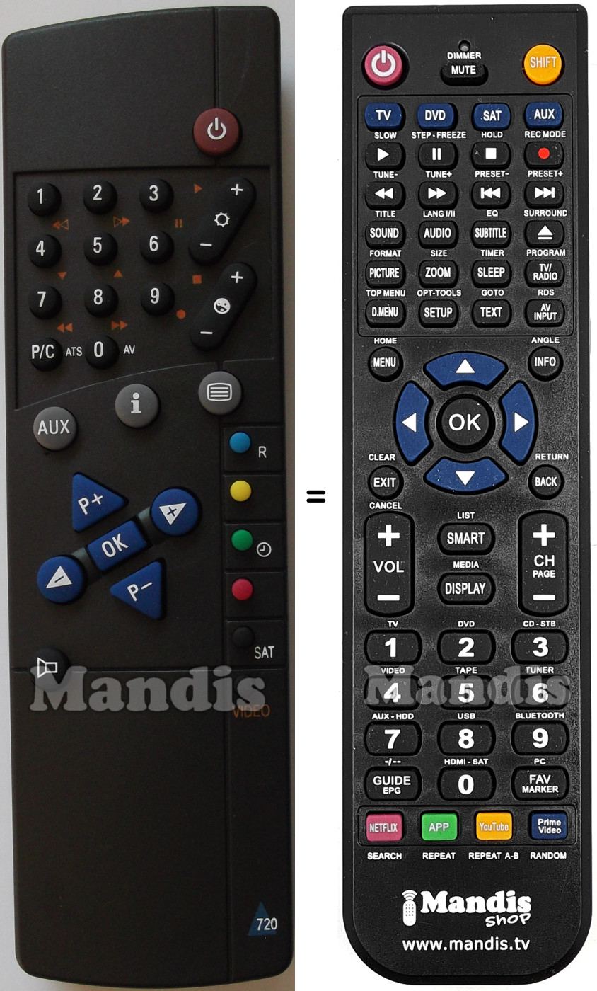 Below, we will show you the correspondence between each button on the original remote control and the button that performs the same function on the replacement remote control. In some cases, you may need to press the SHIFT key before pressing another button to perform certain actions. These additional functions are often not widely used and are included to facilitate understanding of the replacement remote control, or because the original remote control has more buttons than its equivalent.