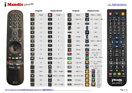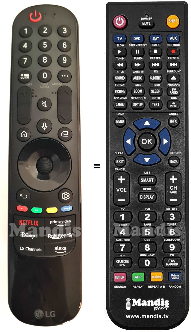 This remote control performs all the functions of the original remote control: Power, 1, 2, 3, 4, 5, 6, 7, 8, 9, 0 / Quick Access, Guide / List, ··· / AD/SAP, Vol+, Vol-, Mute, CH+, CH-, Mic, Home, Source, Up, Left, Down, Right, OK, Back, Settings, Red, Green, Yellow, Blue, Netflix, Prime Video, Disney+, Rakuten TV, LG Channels, Alexa