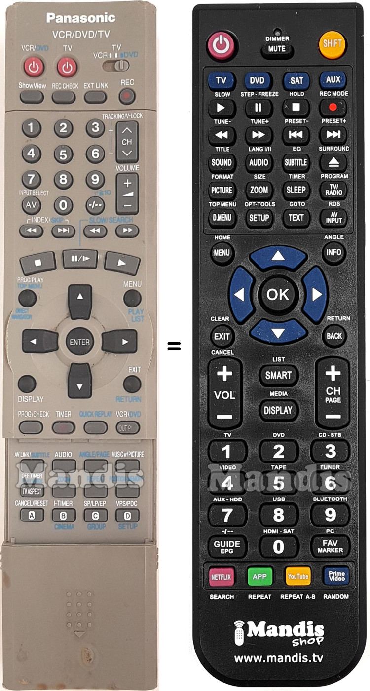 Below, we will show you the correspondence between each button on the original remote control and the button that performs the same function on the replacement remote control. In some cases, you may need to press the SHIFT key before pressing another button to perform certain actions. These additional functions are often not widely used and are included to facilitate understanding of the replacement remote control, or because the original remote control has more buttons than its equivalent.