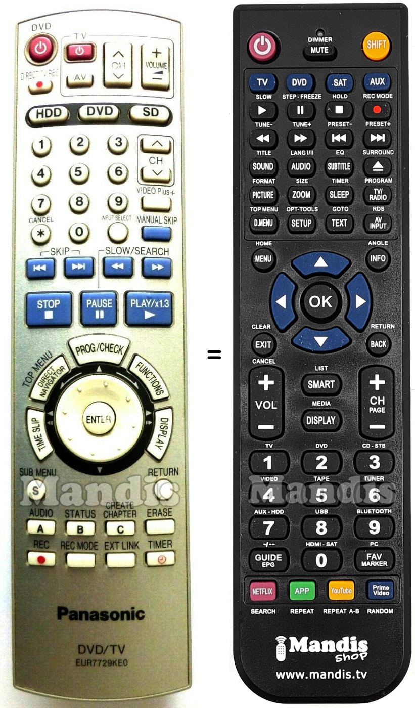 This remote control fully replaces your EUR7729KE0 and offers all the functions of the original.