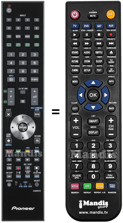 This remote control fully replaces your AXD1572 (RRMCGA687WJSA$J) and offers all the functions of the original.