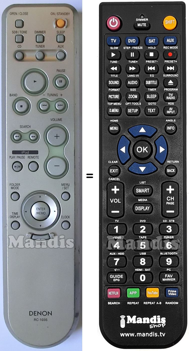 Below, we will show you the correspondence between each button on the original remote control and the button that performs the same function on the replacement remote control. In some cases, you may need to press the SHIFT key before pressing another button to perform certain actions. These additional functions are often not widely used and are included to facilitate understanding of the replacement remote control, or because the original remote control has more buttons than its equivalent.