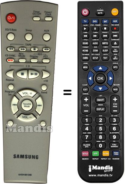 Below, we will show you the correspondence between each button on the original remote control and the button that performs the same function on the replacement remote control. In some cases, you may need to press the SHIFT key before pressing another button to perform certain actions. These additional functions are often not widely used and are included to facilitate understanding of the replacement remote control, or because the original remote control has more buttons than its equivalent.