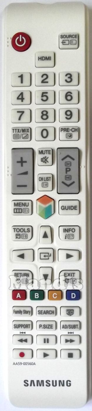 Power, Source, HDMI, 1, 2, 3, 4, 5, 6, 7, 8, 9, 0, TTX / MIX, Pre-CH, Vol +, Vol -, Mute, CH List, P +, P -, Menu, Hub, Guide, Tools, Info, Up, Down, Right, Left, Enter, Return, Exit, Red, Green, Yellow, Blue, Family Story, Search, 3D, Support, P.Size, Ad / Subt., << / I<<, Pause, >> / >>I, Rec, Play, Stop