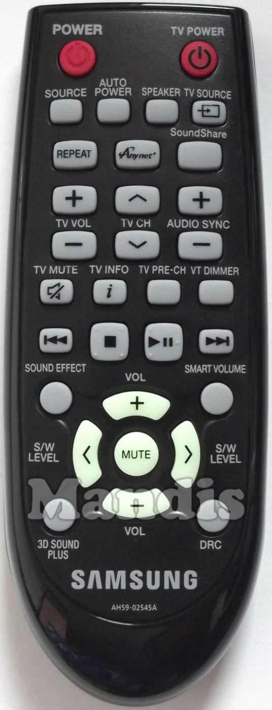Power, TV Power, Source, Auto Power, Speaker, TV Source, Repeat, Anynet, SoundShare, TV Vol +, TV Vol -, TV CH +, TV CH -, Audio Sync +, Audio Sync -, TV Mute, TV Info, TV Pre-Ch, VT Dimmer, I<<, Stop, Play / Pause, >>I, Sound Effect, Smart Volume, Up / Vol +, Down / Vol -, Right / S/W Level +, Left / S/W Level -, OK / Mute, 3D Sound Plus, DRC