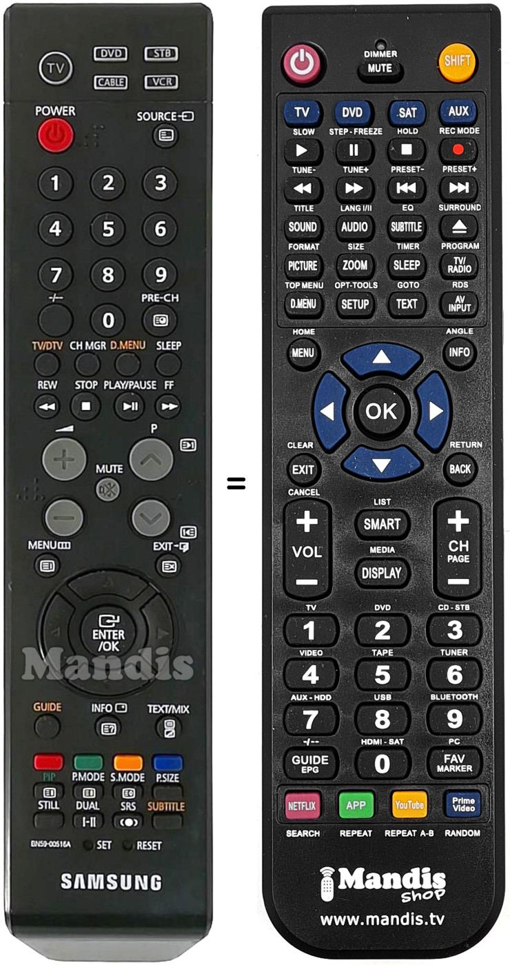 Remote control to replace the original TM 87 B (BN59-00516A) and all its functions. It is not a universal remote but a substitute for the original. You will receive the remote ready to use: you only need to install the batteries. It is not necessary to program it. We offer you our full guarantee that the remote will fulfil all the functions of the original.