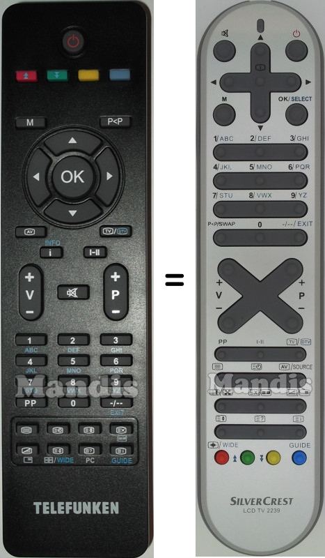This remote control has the following buttons: Mute, Power, M, OK/Select, Up, Down, Right, Left, [i], 1, 2, 3, 4, 5, 6, 7, 8, 9, 0, P<P/Swap, -/--/ Exit, Vol+, Vol-, P+, P-, PP, I-II, Tv/DTV, [=], [=O], AV/Source, [=+]/[X], [=X]/[▪▪], [.=]/[ ▪], [=♦], [=?], [=i], Red/[+]/Wide/↑, Green/↓, Yellow, Blue/Guide