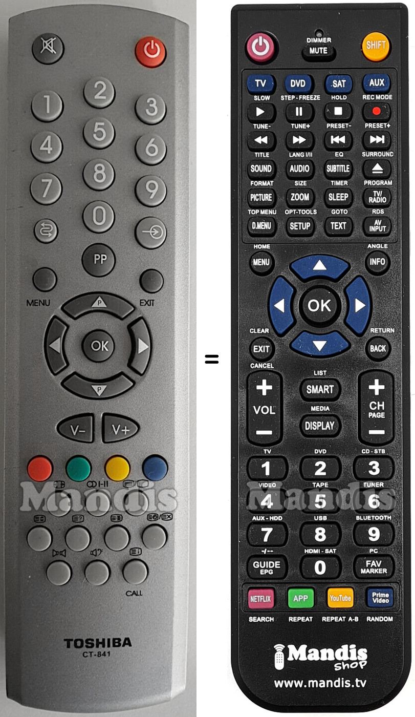 Below, we will show you the correspondence between each button on the original remote control and the button that performs the same function on the replacement remote control. In some cases, you may need to press the SHIFT key before pressing another button to perform certain actions. These additional functions are often not widely used and are included to facilitate understanding of the replacement remote control, or because the original remote control has more buttons than its equivalent.