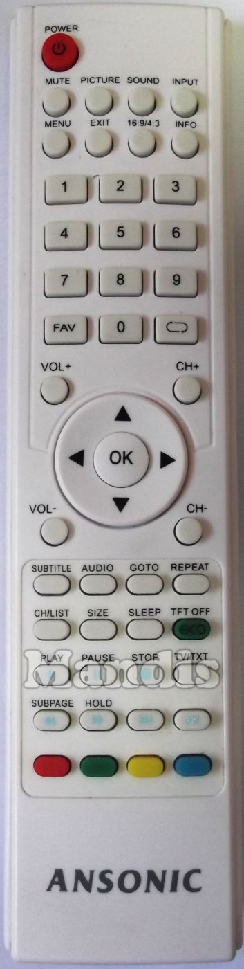 Power, Mute, Picture, Sound, Input, Menu, Exit, 16:9 / 4:3, Info, 1, 2, 3, 4, 5, 6, 7, 8, 9, 0, Fav, Recall, Vol +, Vol -, CH+, CH-, Up, Right, Down, Left, OK, Subtitle, Audio, Goto, Repeat, CH List, Size, Sleep, ECO / TFT Off, Play, Pause, Stop, TV / Txt, << / Subpage, >> / Hold, I<<, >>I, Red, Green, Yellow, Blue