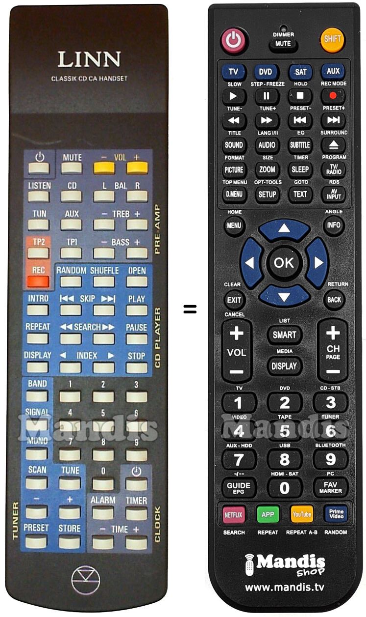 Cette télécommande remplit toutes les fonctions de la télécommande d'origine: Power, PRE-AMP Mute, PRE-AMP Vol-, PRE-AMP Vol+, PRE-AMP LISTEN, PRE-AMP CD, PRE-AMP TUN, PRE-AMP AUX, PRE-AMP TP1, PRE-AMP TP2, PRE-AMP Rec, PRE-AMP Bal L, PRE-AMP Bal R, PRE-AMP Treb-, PRE-AMP Treb+, PRE-AMP Bass-, PRE-AMP Bass+, CD Random, CD Shuffle, CD Open, CD Intro, CD I<< Skip, CD Skip >>I, CD Play, CD Repeat, CD << Search, CD Search >>, CD Pause, CD Display, CD < Index, CD Index >, CD Stop, TUNER Band, TUNER Signal, TUNER Mono, TUNER Scan, TUNER Tune, TUNER +, TUNER -, TUNER Preset, TUNER Store, 1, 2, 3, 4, 5, 6, 7, 8, 9, 0, CLOCK ◴, CLOCK Alarm, CLOCK Timer, CLOCK Time-, CLOCK Time+