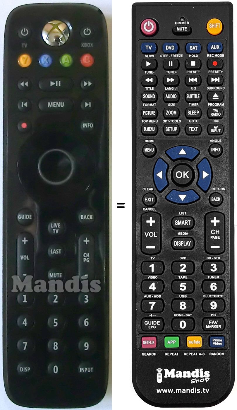 POWER TV, POWER XBOX, YELLOW/ Y, BLUE/ X, GREEN/A, RED/B, <<, PLAY/PAUSE, >>, I<, >I, MENU, REC, INFO, OK, UP, DOWN, RIGHT, LEFT, GUIDE, BACK, LIVE TV, LAST, MUTE, VOL+, VOL-, CH+, CH-, 1, 2, 3, 4, 5, 6, 7, 8, 9, 0, DISP, INPUT, WORLD