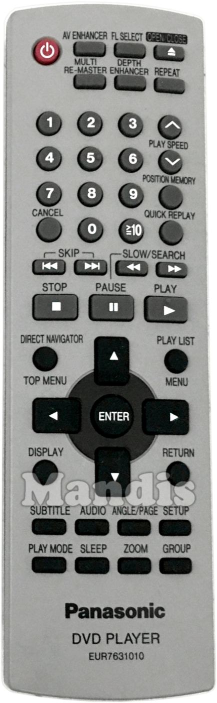 Power, AV Enhancer, FL Select, Open / Close, Multi Re-Master, Depth Enhancer, Repeat, 1, 2, 3, 4, 5, 6, 7, 8, 9, 0, ≧10, Cancel, ᐱ Play Speed +, ᐯ Play Speed -, Position Memory, Quick Replay, ▮◀◀ Skip, ▶▶▮ Skip, ◀◀ Slow/Search, ▶▶ Slow/Search, ◼ Stop, ▮▮ Pause, ▶ Play, Direct Navigator / Top Menu, Play List / Menu, Up, Left, Enter, Right, Down, Display, Return, Subtitle, Audio, Angle / Page, Setup, Play Mode, Sleep, Zoom, Group