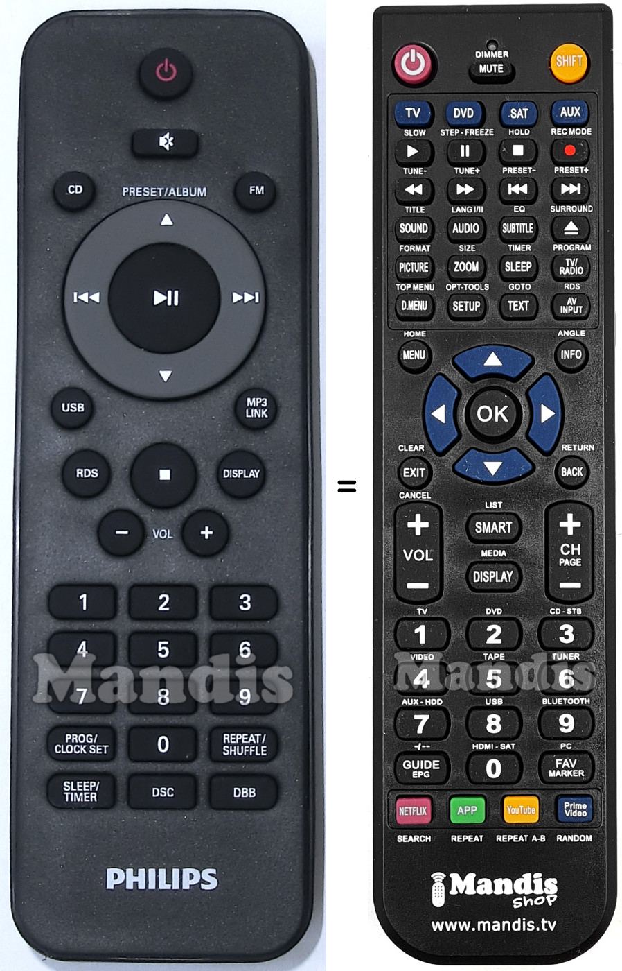 Ci-dessous, nous vous montrerons la correspondance entre chaque bouton de la télécommande d'origine et le bouton qui effectue la même fonction sur la télécommande de remplacement. Dans certains cas, vous devrez peut-être appuyer sur la touche SHIFT avant d'appuyer sur un autre bouton pour effectuer certaines actions. Ces fonctions supplémentaires sont souvent peu utilisées et sont incluses pour faciliter la compréhension de la télécommande de remplacement, ou parce que la télécommande d'origine comporte plus de boutons que son équivalent.
