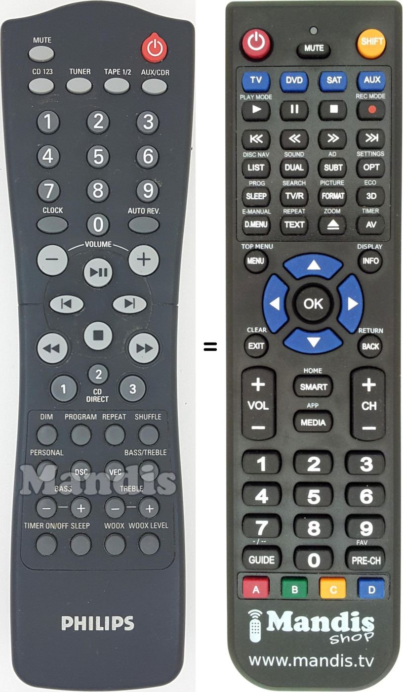 Ci-dessous, nous vous montrerons la correspondance entre chaque bouton de la télécommande d'origine et le bouton qui effectue la même fonction sur la télécommande de remplacement. Dans certains cas, vous devrez peut-être appuyer sur la touche SHIFT avant d'appuyer sur un autre bouton pour effectuer certaines actions. Ces fonctions supplémentaires sont souvent peu utilisées et sont incluses pour faciliter la compréhension de la télécommande de remplacement, ou parce que la télécommande d'origine comporte plus de boutons que son équivalent.