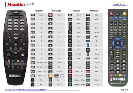 Cette télécommande remplace la plupart des fonctions de votre REMCON1191. Il ne s'agit pas d'une télécommande universelle, mais d'une copie avec la plupart des touches et des fonctions de votre télécommande d'origine.