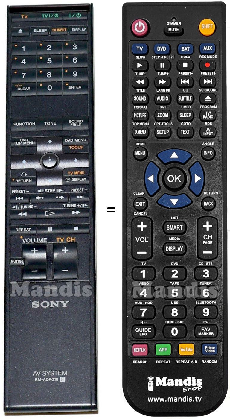 Cette télécommande remplace la plupart des fonctions de votre RM-ADP018. Il ne s'agit pas d'une télécommande universelle, mais d'une copie avec la plupart des touches et des fonctions de votre télécommande d'origine.