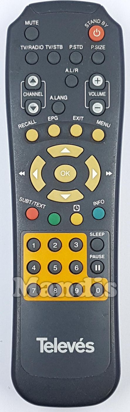 Stand By, Mute, Tv/Radio, Tv/STB, P.STD, P.Size, A.L/R, Channel+, Channel-, Volume+, Volume-, A.Lang, Recall, , Exit, Menu, Up, Left, Right/>>, Left/<<, OK, Red/SUBT/Text, Green, Yellow/Timer, Blue/Info, 1, 2, 3, 4, 5, 6, 7, 8, 9, 0, Sleep, Pause