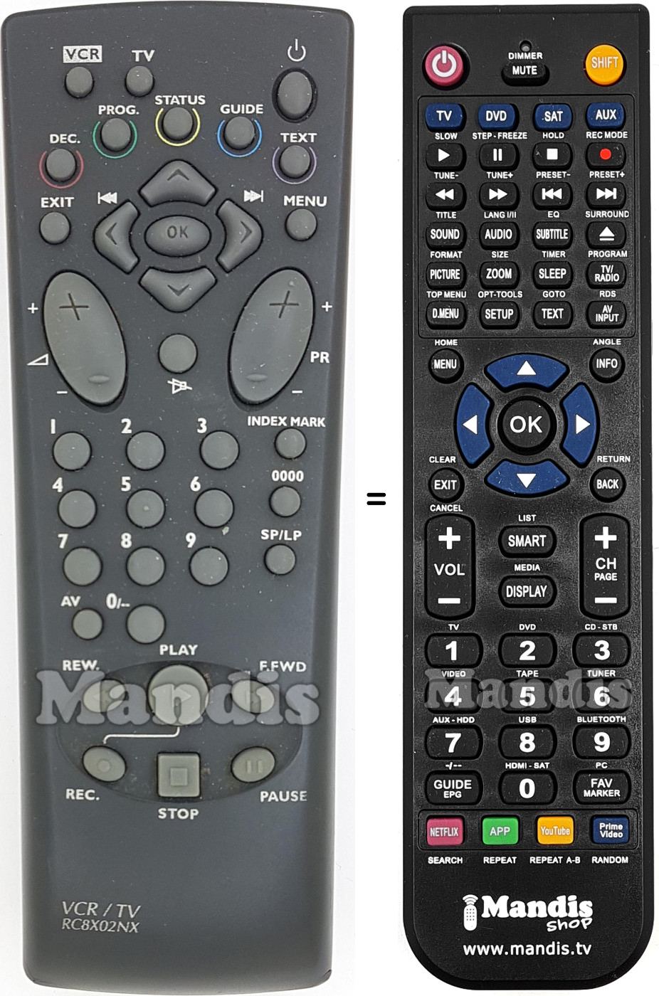 Di seguito, vi mostreremo la corrispondenza tra ciascun pulsante del telecomando originale e il pulsante che svolge la stessa funzione sul telecomando di sostituzione. In alcuni casi, potrebbe essere necessario premere il tasto SHIFT prima di premere un altro pulsante per eseguire determinate azioni. Queste funzioni aggiuntive sono spesso poco utilizzate e sono incluse per facilitare la comprensione del telecomando di sostituzione, o perché il telecomando originale ha più pulsanti rispetto al suo equivalente.