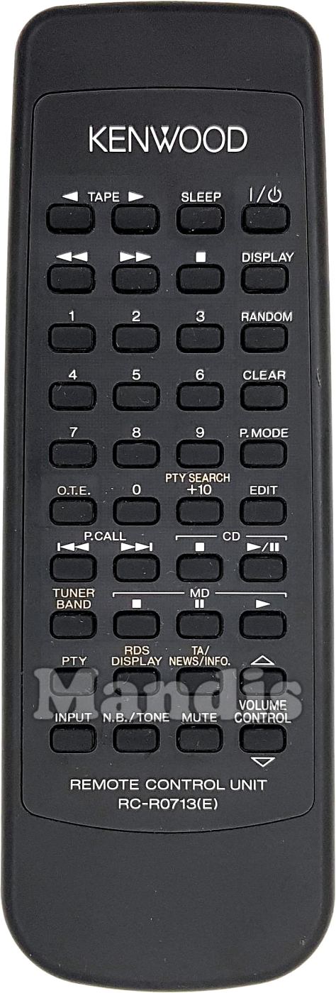 Power, Sleep, Tape Play, Tape Play Reverse, <<, >>, Stop, Display, 1, 2, 3, 4, 5, 6, 7, 8, 9, 0, +10 / PTY Search, O.T.E., Random, Clear, P.Mode, Edit, I<< / P.Call -, >>I / P.Call +, CD Stop, CD Play / Pause, Tuner Band, MD Stop, MD Pause, MD Play, PTY, RDS Display, TA / News / Info., Input, N.B. / Tone, Mute, Volume Control +, Volume Control -