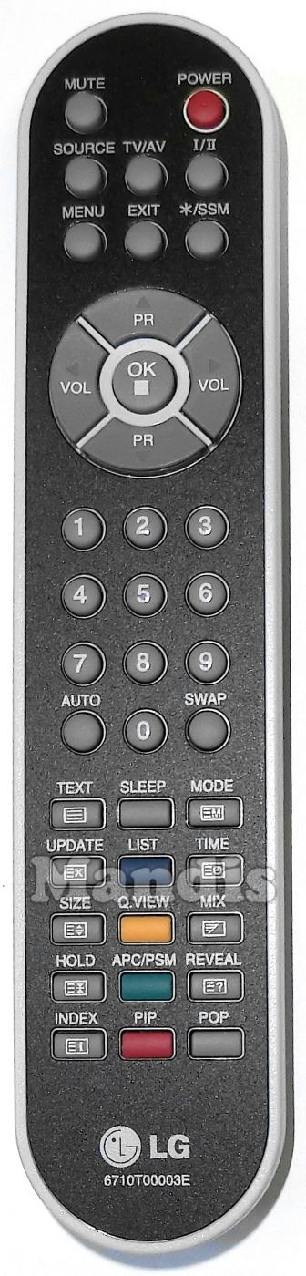 Power, Mute, Source, TV / AV, I / II, Menu, Exit, */SSM, Up / PR +, Down / PR -, Right / Vol +, Left / Vol -, OK / Stop, 1, 2, 3, 4, 5, 6, 7, 8, 9, 0, Auto, Swap, Text, Sleep, Mode, Update, Blue / List, Time, Size, Yellow / Q.View, Mix, Hold, APC / PSM, Reveal, Index, Red / PIP, POP