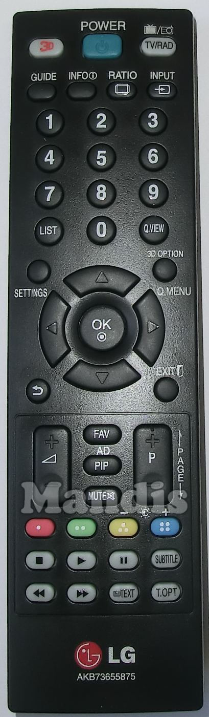 POWER, 3D, TV/RAD, GUIDE, INFO, RATIO, INPUT, 1, 2, 3, 4, 5, 6, 7, 8, 9, 0, LIST, Q.VIEW, SETTINGS, 3D OPTION/Q.MENU, BACK, EXIT, OK, UP, DOWN, RIGHT, LEFT, VOL+, VOL-, P+, P-, FAV, PIP/AD, MUTE, RED, GREEN, Yellow/-☼, Blue/☼+, STOP, PLAY, PAUSE, SUBTITLE, <<, >>, TEXT, T.OPT