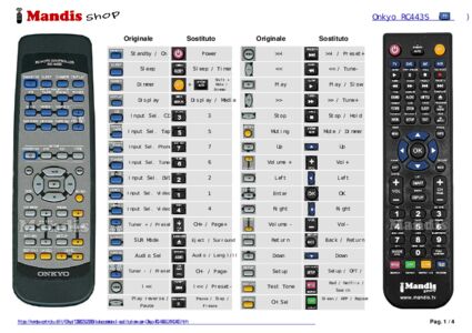 Questo telecomando esegue tutte le funzioni del telecomando originale: Standby / On, Sleep, Dimmer, Display, CD, Input Tape, Slector Phono, Tuner, DVD, Video 1, Video 2, SUR. Mode, SW Mode, Audio Sel, Tuner + / Preset +, Tuner - / Preset -, Mode Standby / On, Mode DVD, Mode CD, Mode Tape, I<<, >>I, Play Reverse / Pause, <<, Play, >>, Stop, Disc, Muting, Top Menu, Menu, Up, Right, Down, Left, Enter, Volume +, Volume -, Return, Setup, Test Tone, CH Sel, Level -, Level +