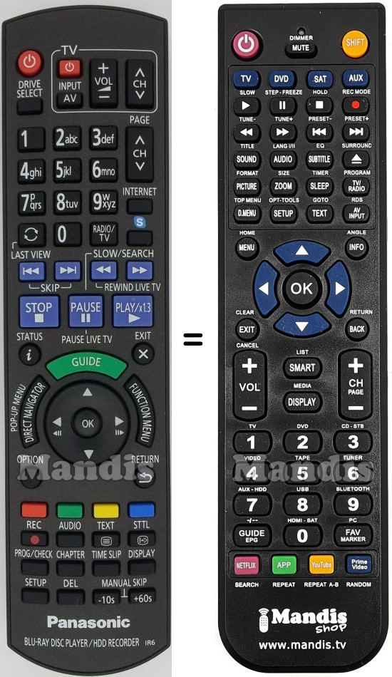 power, drive select, power tv, input av tv, vol+ tv, vol- tv, ch+ tv, ch- tv, 1, 2, 3, 4, 5, 6, 7, 8, 9, 0, recall, radio/tv, ch+, ch-, internet, skype, i<<, >>I, <<, >>, stop, play/x1.3, pause, i/Status, x/exit, option, return, ok, up, down, Right/II>, <II/Left, guide, function menu, pop-up menu/direct navigator, red, green, yellow, blue, rec, audio, text, sttl, prog/check, chapter, time slip, display, setup, del, Manual Skip -10s, Manual Skip +60s