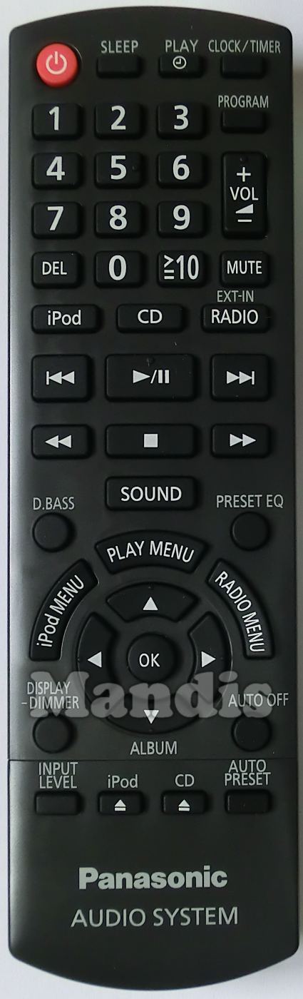 Power, Sleep, Play, Clock/Timer, 1, 2, 3, 4, 5, 6, 7, 8, 9, 0, DEL, +10, Program, Vol+, Vol-, Mute, iPod, CD, Radio/EXT-IN, I<<, Play/Pause, >>I, <<, Stop, >>, Sound, D.Bass, Preset EQ, iPod Menu, Play Menu, Radio Menu, Up, Down/Album, Left, Right, OK, Display-Dimmer, Auto Off, Input Level, Eject/iPod, CD, Auto Preset